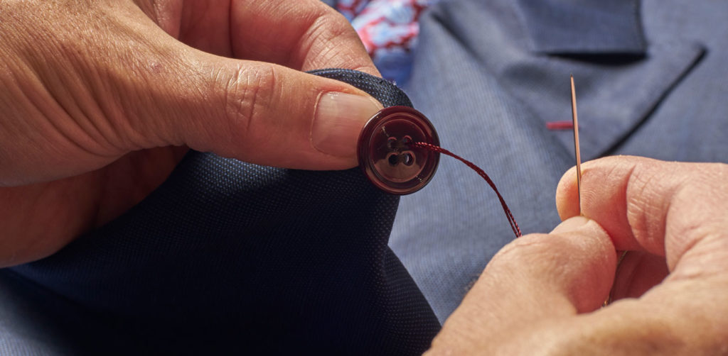 Finally, we’ll help you determine if you’re going for a double-breasted, two or three button jacket. A really fine, elegant detail that speaks to the quality of a custom jacket are the buttonholes. Just like on the cuffs, the buttonholes on the body are hand-sewn with silk thread.